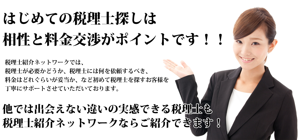 税理士紹介ネットワークは手数料一切不要の税理士紹介サービスです。 当ネットワークでは、ご紹介する専門家に関するこだわりがあります。税理士に関しても、他の税理士紹介サービスにない税理士の登録審査により、スキルや実績はもちろん、お客様に対する姿勢やコミュニケーションなどサービス業としての意識を持ち合わせた税理士のみをご紹介できる仕組みを構築しています。 そのため、当ネットワークに参加する税理士には、お客様に対して柔軟・迅速・丁寧なご対応を』という当ネットワークのサービスポリシーを税理士にも徹底しており、価格、サービス内容、対応地域、契約形態など、お客様のご要望に合わせて、税理士にも柔軟に対応してもらえることが、多くのお客様からご支持いただいている理由です。