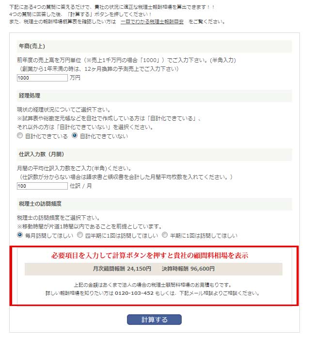 下記にある4つの質問に答えるだけで、貴社の状況に適正な税理士報酬相場を算出できます!!
